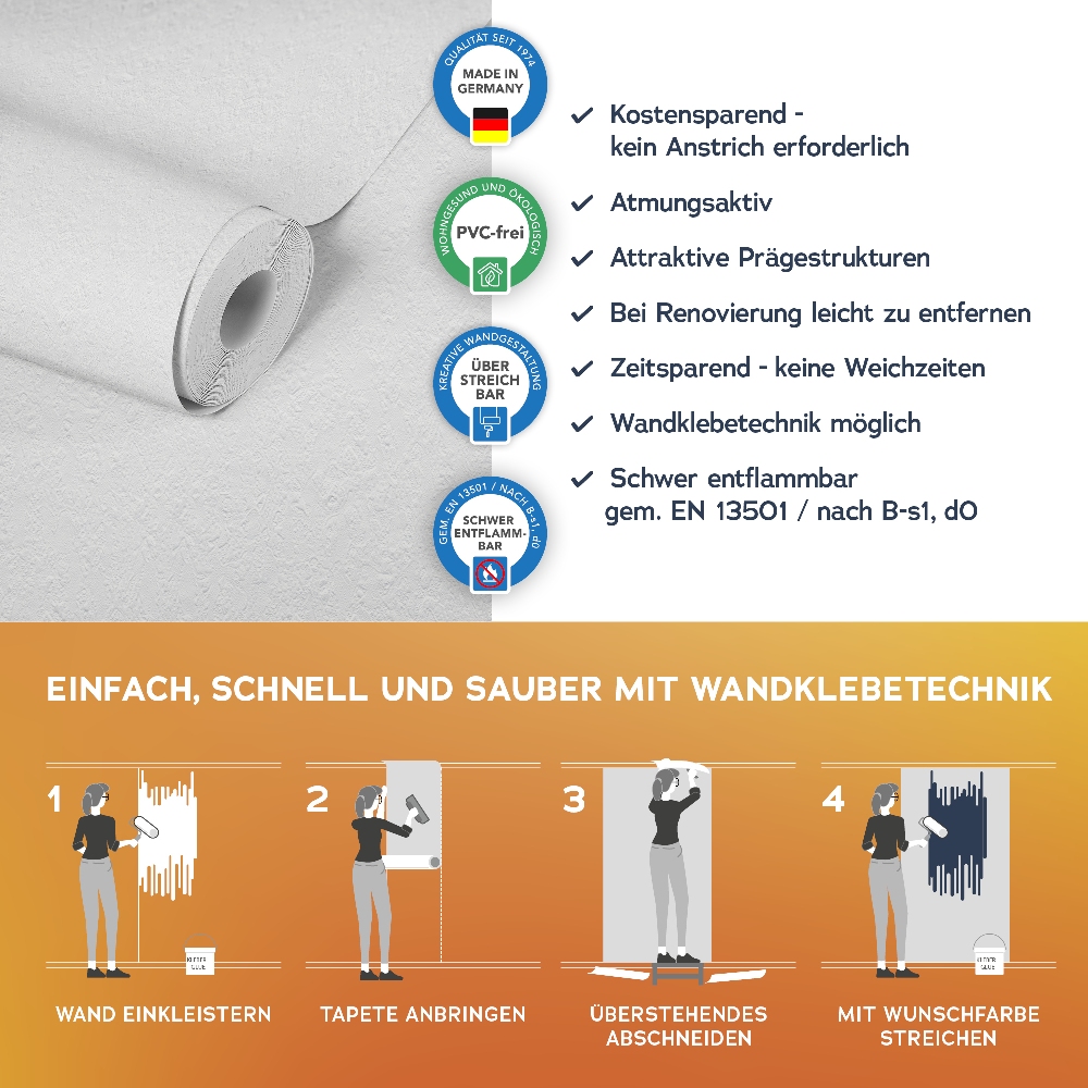 Alle wichtigen Informationen finden Sie auch auf dem Beipackzettel jeder Tapetenrolle.