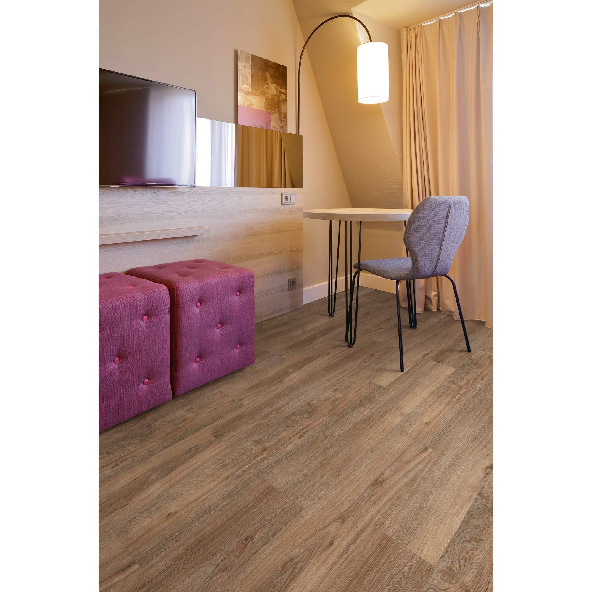 Der Vinyl Designboden von PROJECT FLOORS überzeugt nicht nur durch authentische Holzoptik, sondern ist auch ideal für Räume mit Fußbodenheizung geeignet und widersteht mühelos Stuhlrollen. Mit einer 4-seitigen Fase präsentiert sich der Boden in einem zeitlosen Dielenformat und verleiht deinem Raum eine warme, natürliche Atmosphäre.