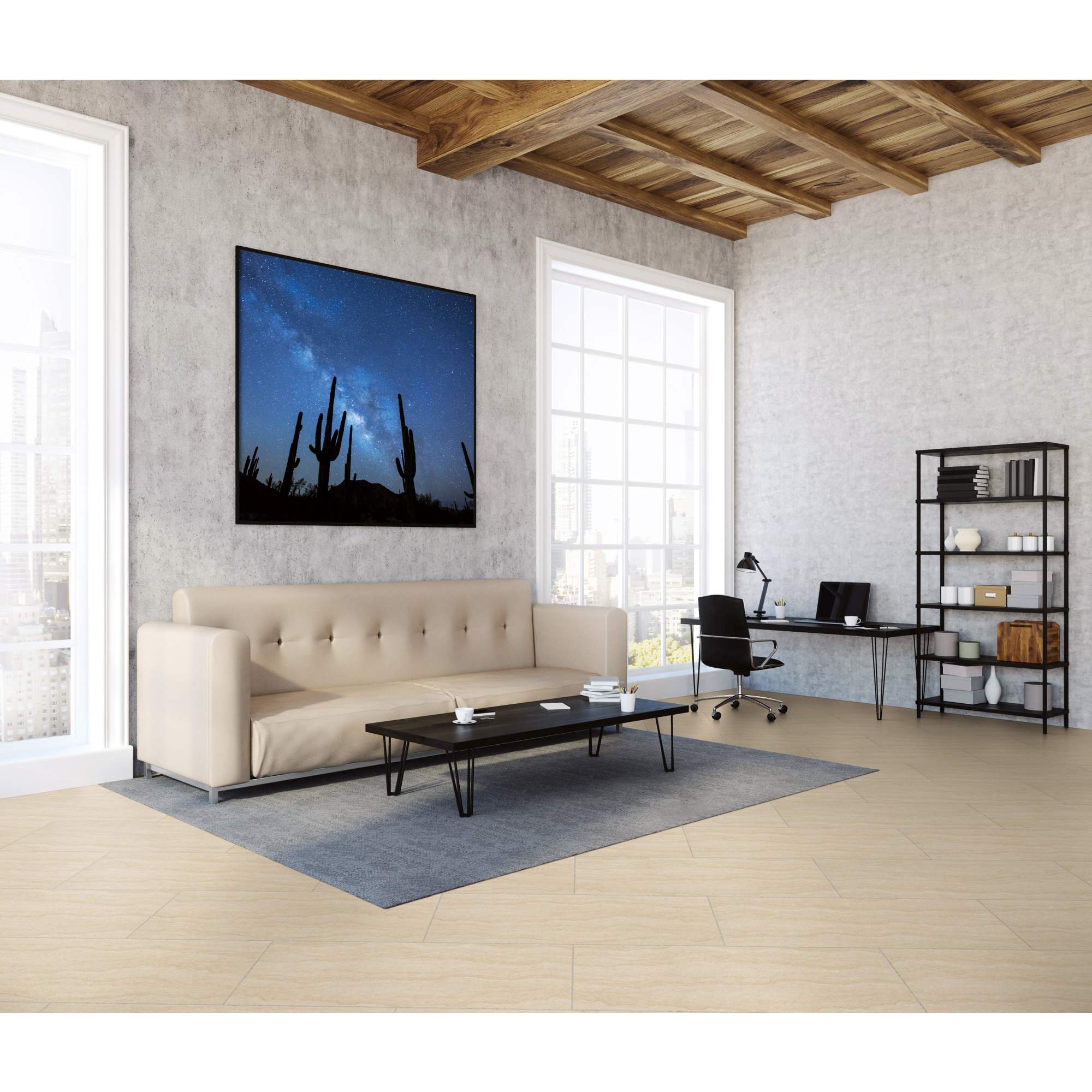Der Vinyl Designboden von PROJECT FLOORS vereint die Eleganz von Steinoptik mit praktischer Verlegung im Fliesenformat. Geeignet für Stuhlrollen und Fußbodenheizung, setzt dieser Boden nicht nur ästhetische, sondern auch funktionale Akzente. Die 4-seitige Fase verleiht dem Boden ein modernes Flair und unterstreicht die Struktur der Oberfläche mit PU-Beschichtung (Polyurethan).