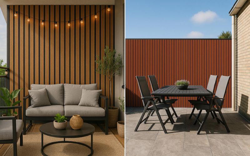 - Terrassenwände & Outdoor-Lounges: Schaffe mit einer Akzentwand aus WPC Paneelen einen stilvollen Rahmen für deine Sitzecke im Freien. Ideal als Rückwand für Lounge-Möbel oder als Highlight hinter einem Grillplatz.