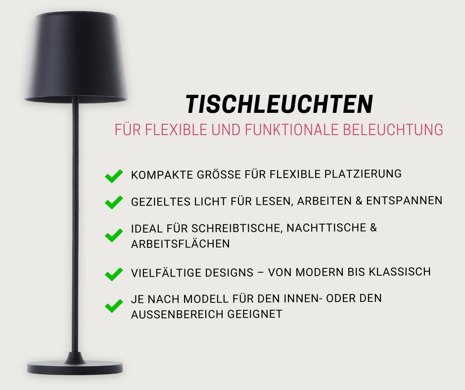 Tischleuchten sind vielseitige Lichtquellen, die Funktionalität und Design perfekt verbinden. Ob Modelle mit integrierter LED-Technologie oder solche, die mit LED-Leuchtmitteln ausgestattet werden können - Tischleuchten sind ideal, um eine warme, einladende Atmosphäre zu schaffen und zugleich dekorative Akzente zu setzen.