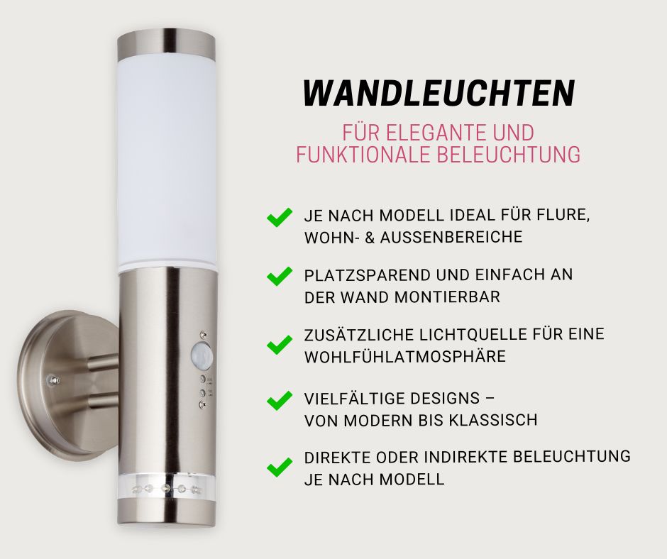Von minimalistisch-modern bis hin zu klassisch-elegant - Wandleuchten fügen sich nahtlos in jede Einrichtung ein. Sie sind ideal, um gezielt Akzente zu setzen, gemütliche Beleuchtung zu schaffen oder auch als praktische Lichtquelle für Flure und Treppenhäuser.