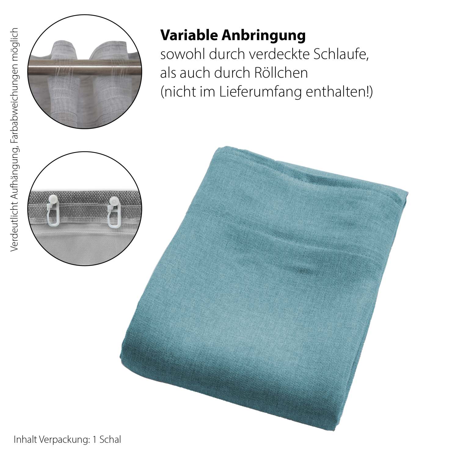 Am Fenster fertig dekoriert, reduziert sich die Gardine um etwa die Hälfte der Breite. Die Aufhängung an der Gardinenstange erfolgt mittels Ösen. Die Gardine ist in verschiedenen Farben erhältlich.