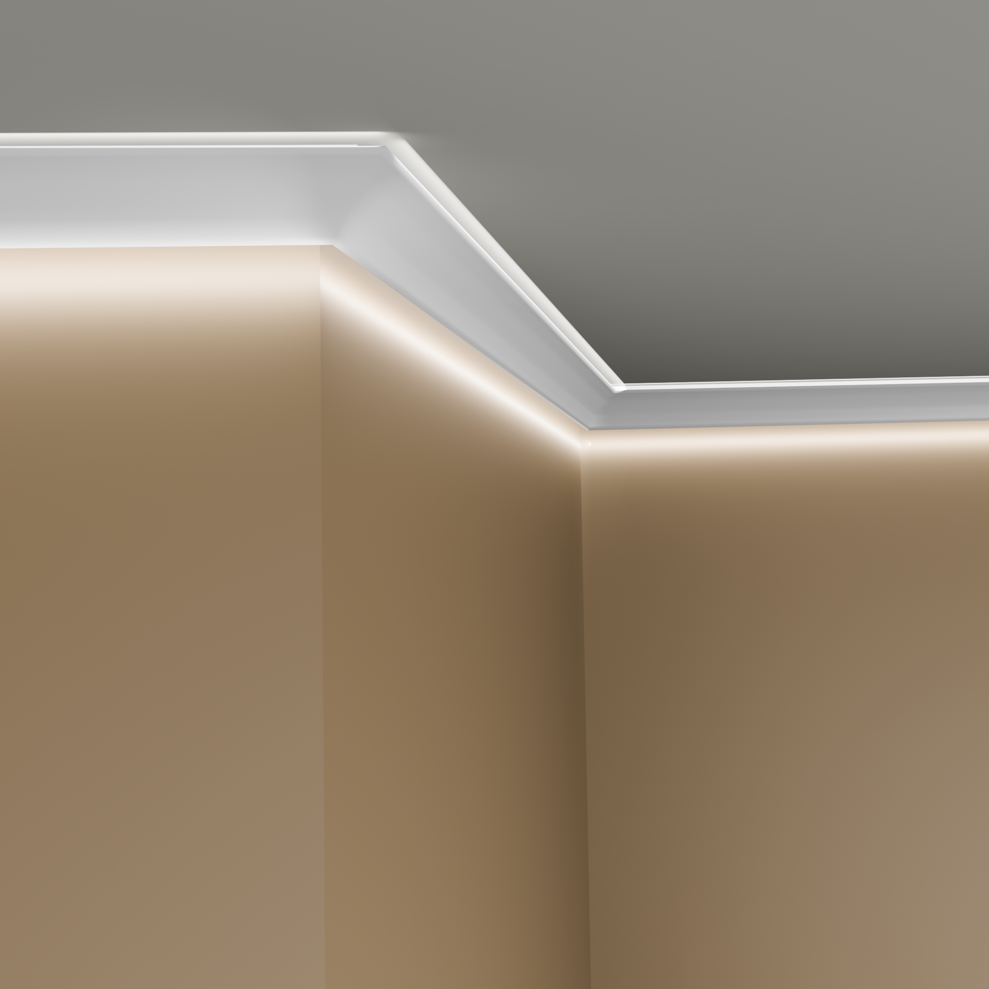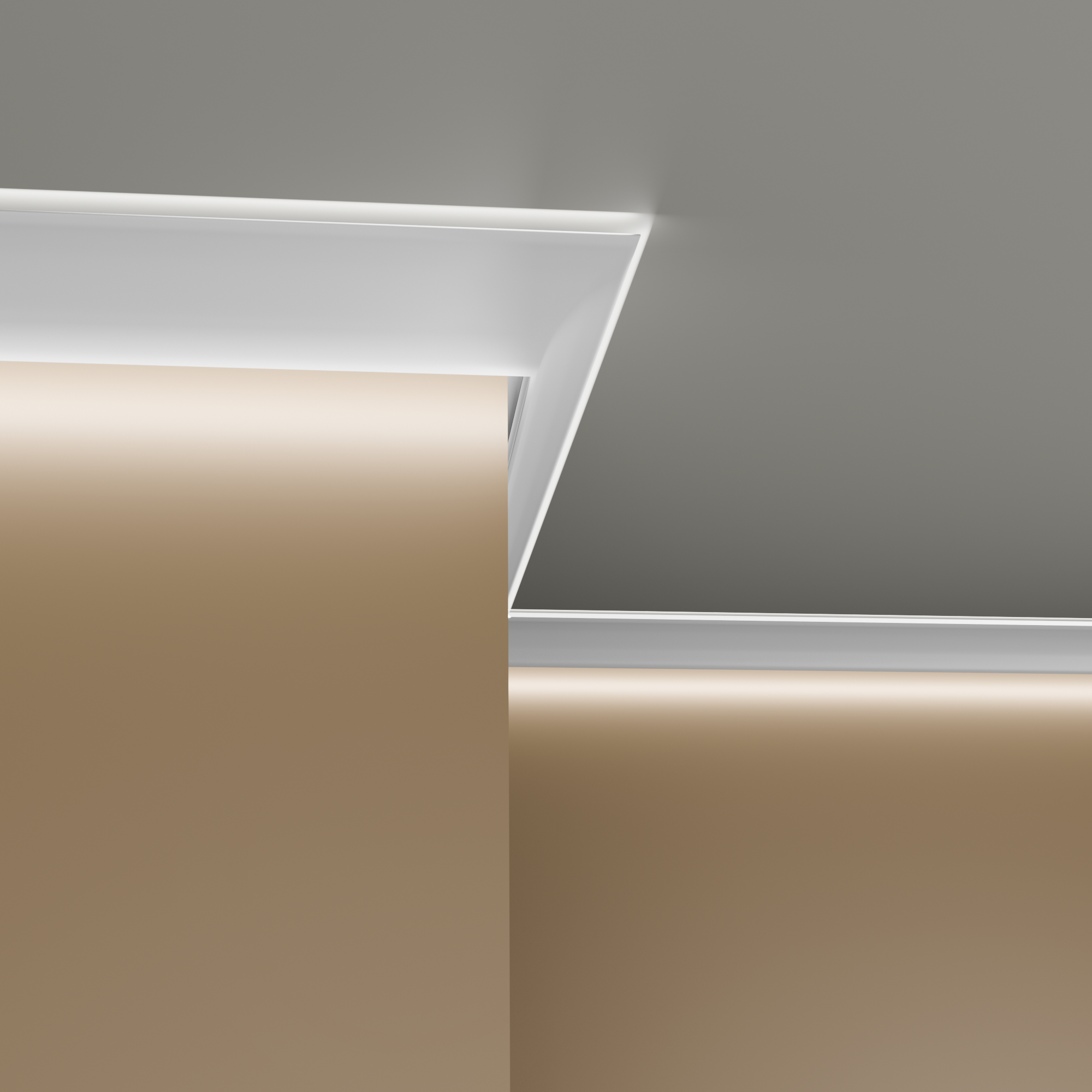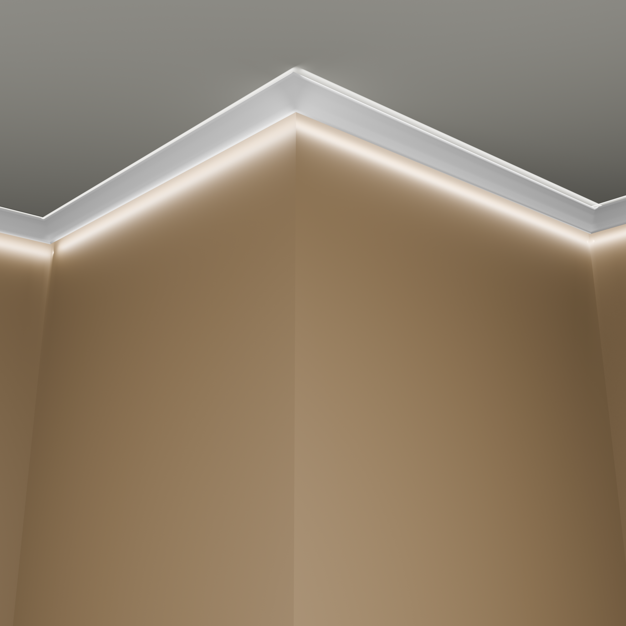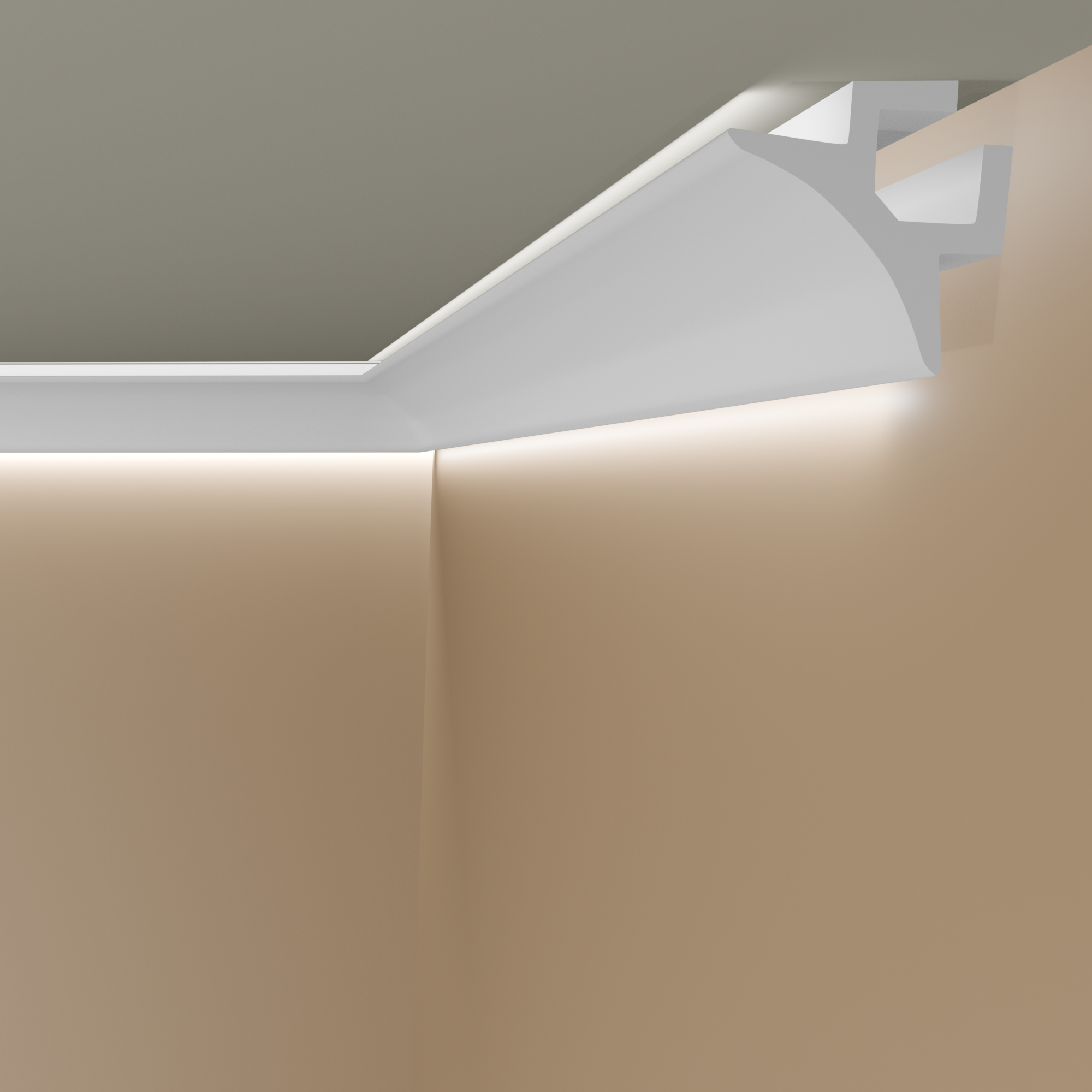 Unsere stilvoll gestalteten Deckenleisten sind für jede Raumgestaltung geeignet. Das zeitlose und moderne Profildesign sorgt für ein harmonisches Gesamtbild und eine nahtlose Verbindung von Wand und Decke. In der Nut dieser Leisten können flexible LED-Streifen eingefügt werden. Die indirekte LED-Beleuchtung schafft eine warme und einladende Atmosphäre. Passendes LED-Zubehör ist ebenfalls in unserem Shop erhältlich.
