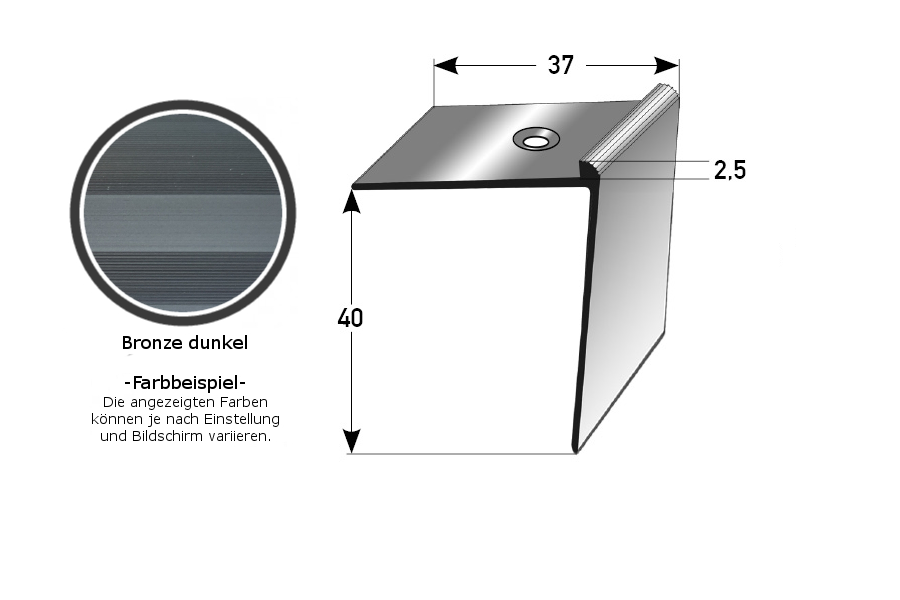 - GRÖSSE: Das Winkelprofil mit den Abmessungen 37 x 40 x 1000 mm hat eine Einfasshöhe von 2.5 mm und schafft einen sauberen Abschluss an der Treppenkante.