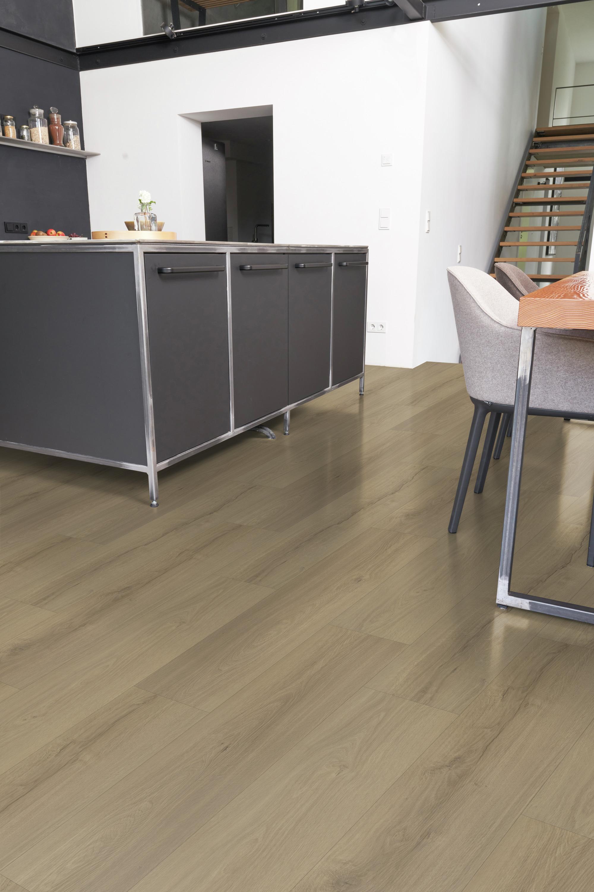 - HOCHBELASTBAR: Vinylboden mit Trägerplatte und integrierter Trittschalldämmung