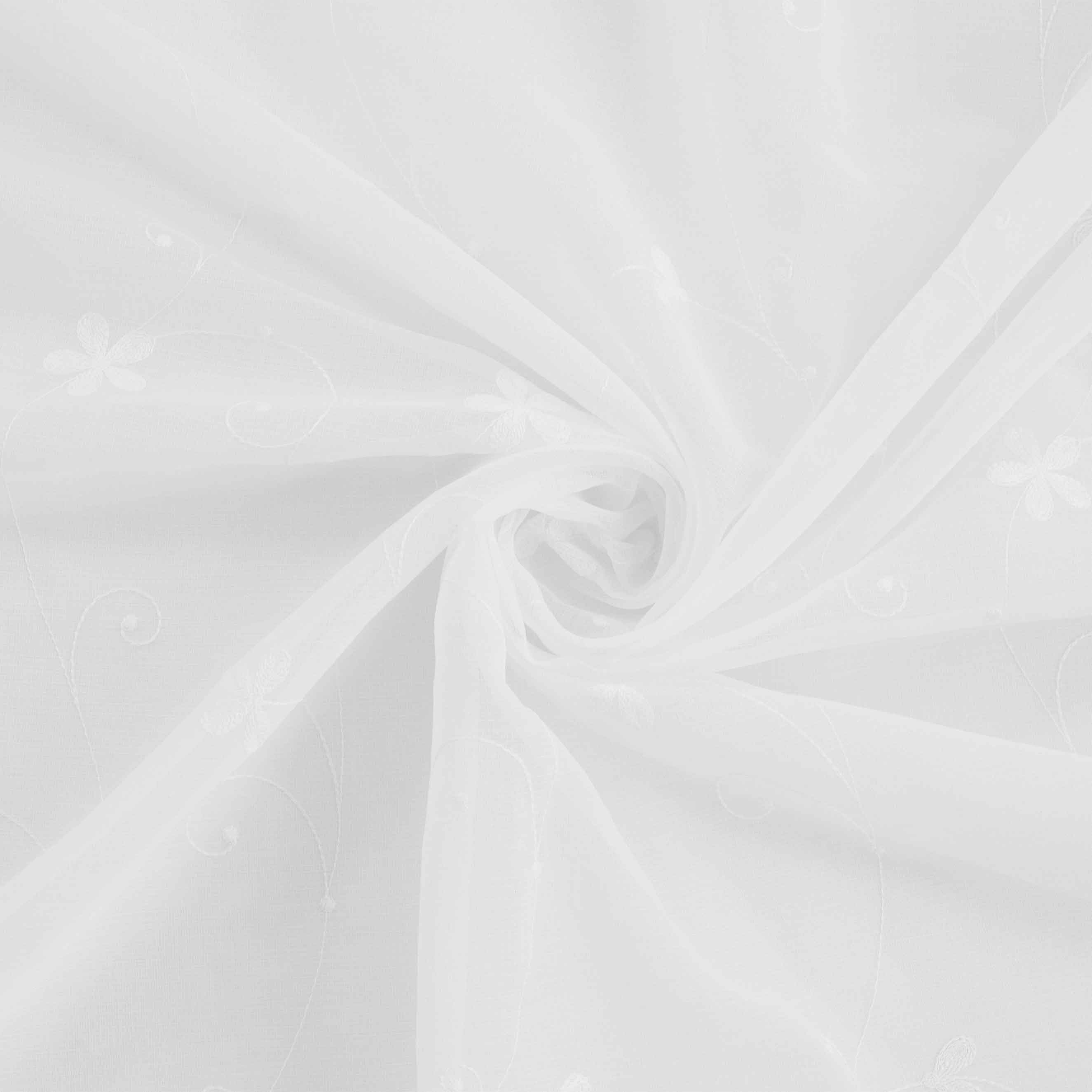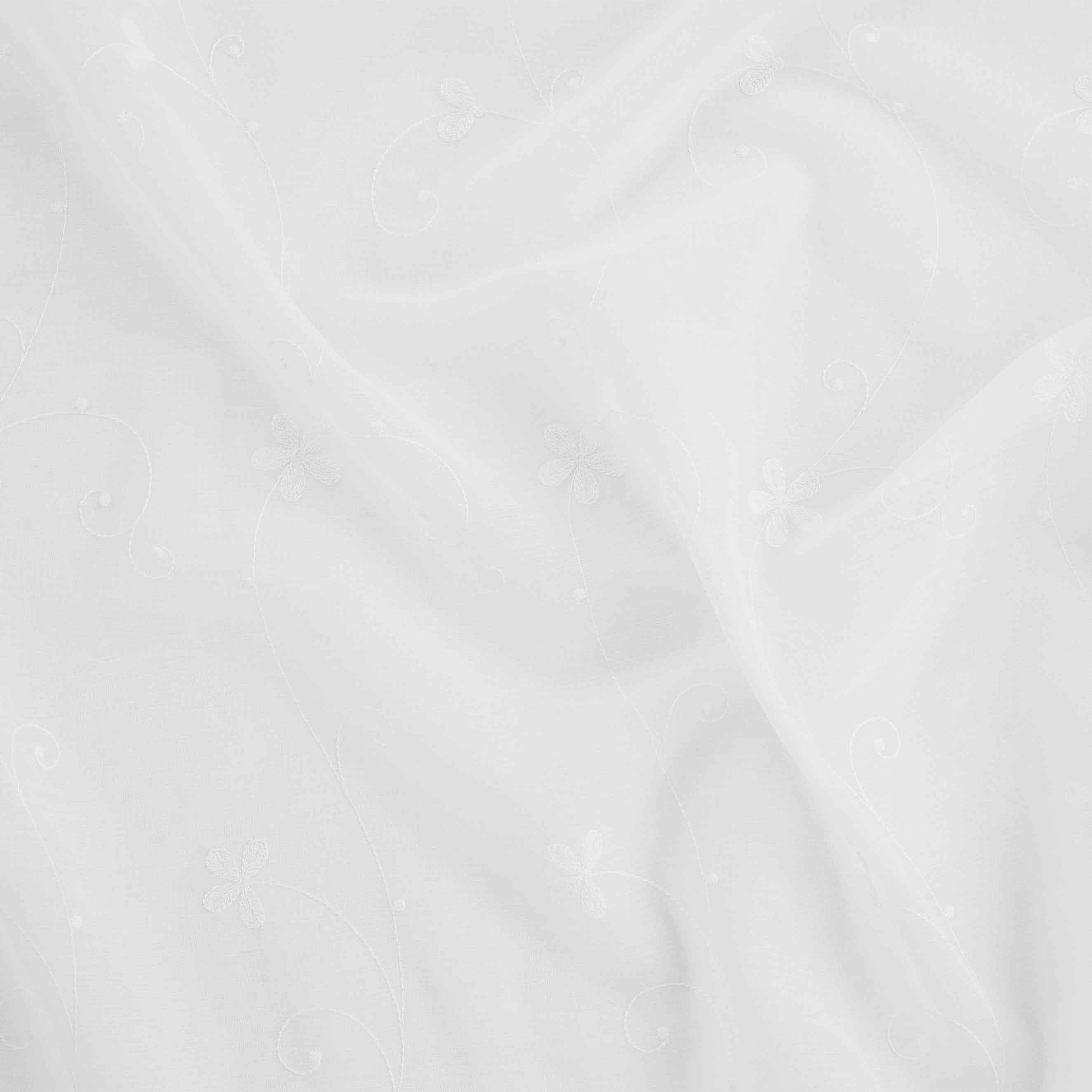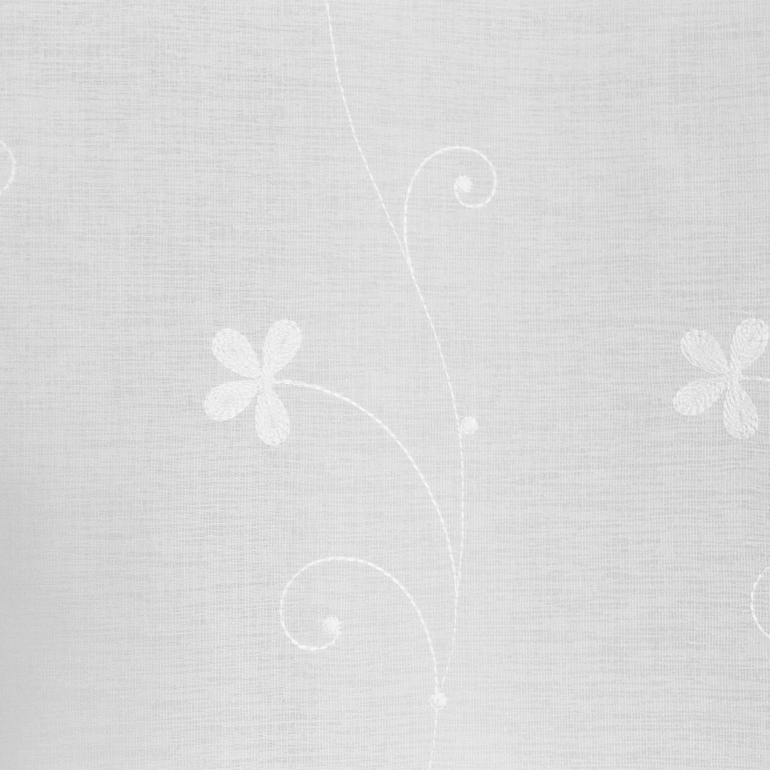 Verspielte Blumenranken zieren Artikel Elisabetta. Der halbtransparente Fertigschal mit verdeckter Schlaufe ist zusätzlich mit Bindebändern versehen, sodass je nach Geschmack und Gegebenheiten verschiedene Möglichkeiten zur Aufhängung bestehen.
