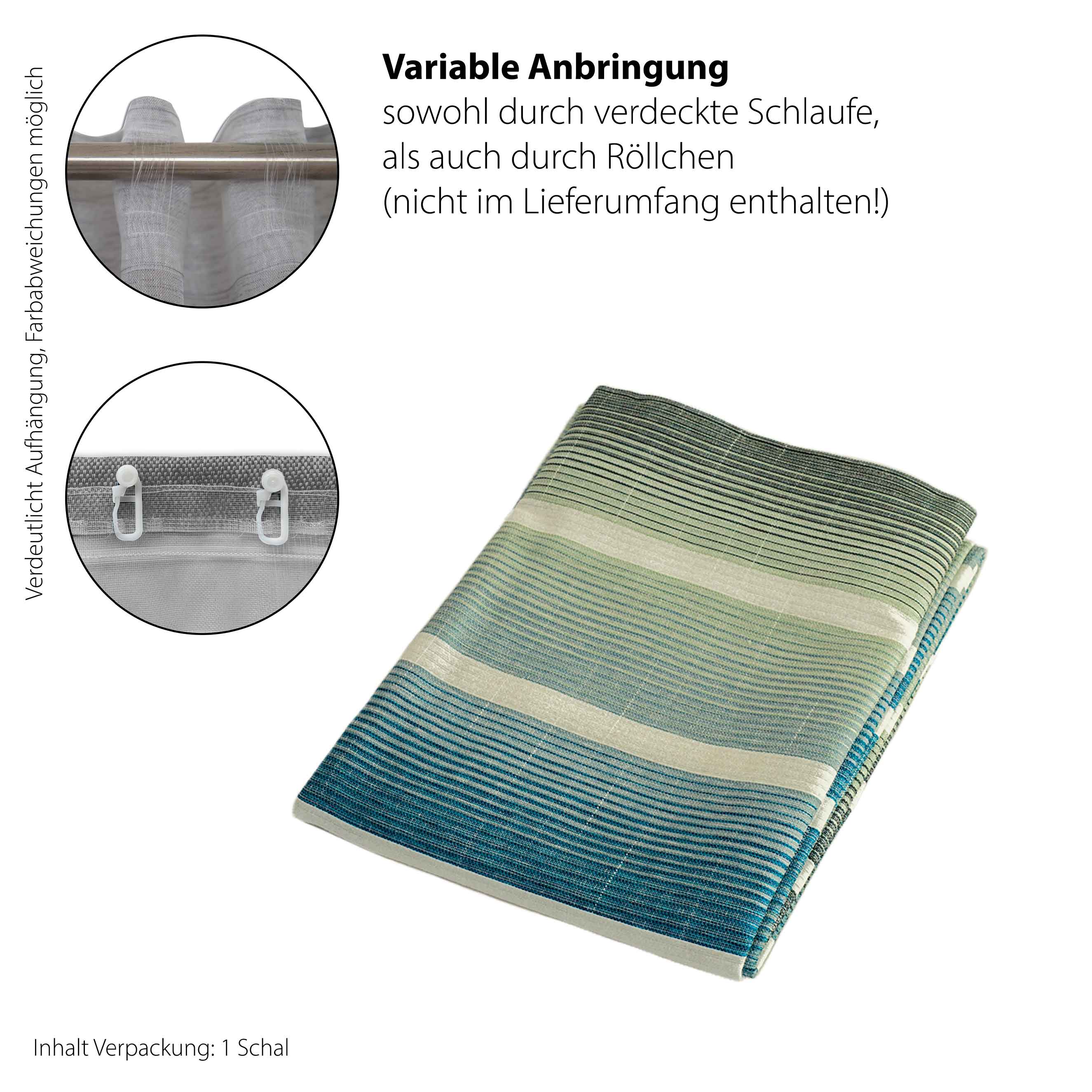 Der quergestreifte, verdeckte Schlaufenschal Giovanna ist ein absoluter Eyecatcher. Die Querstreifen enthalten einen eleganten Farbverlauf und sind somit ein Hingucker, egal ob für ihr Schlaf-, Wohn- oder Kinderzimmer. Der Schal kommt in drei Farbvarianten daher und lässt sich mit den stabilen verdeckten Schlaufen aus Nylon, welche von hinten fast unsichtbar sind, einfach auf einer Gardinenstange aufhängen.