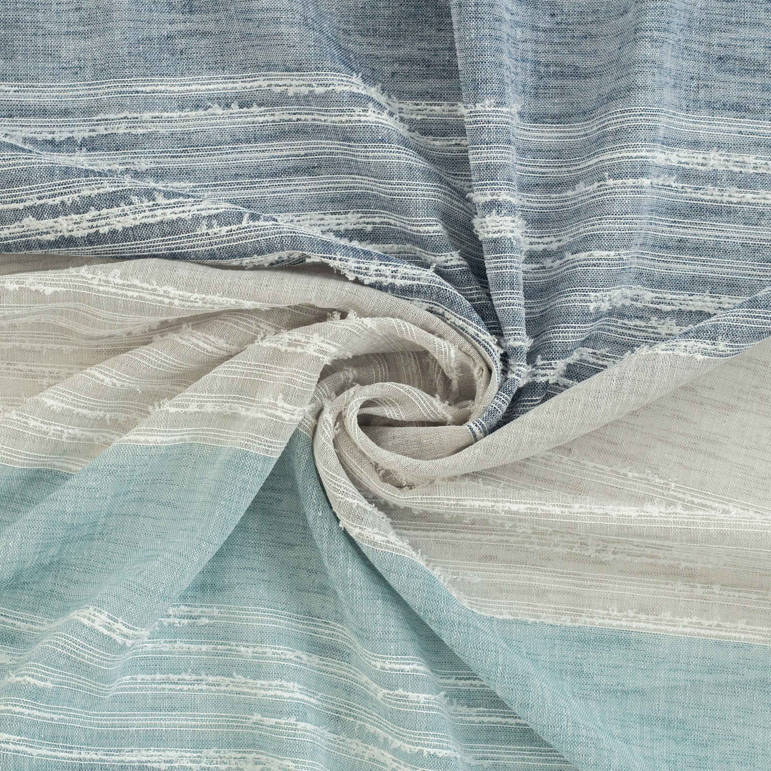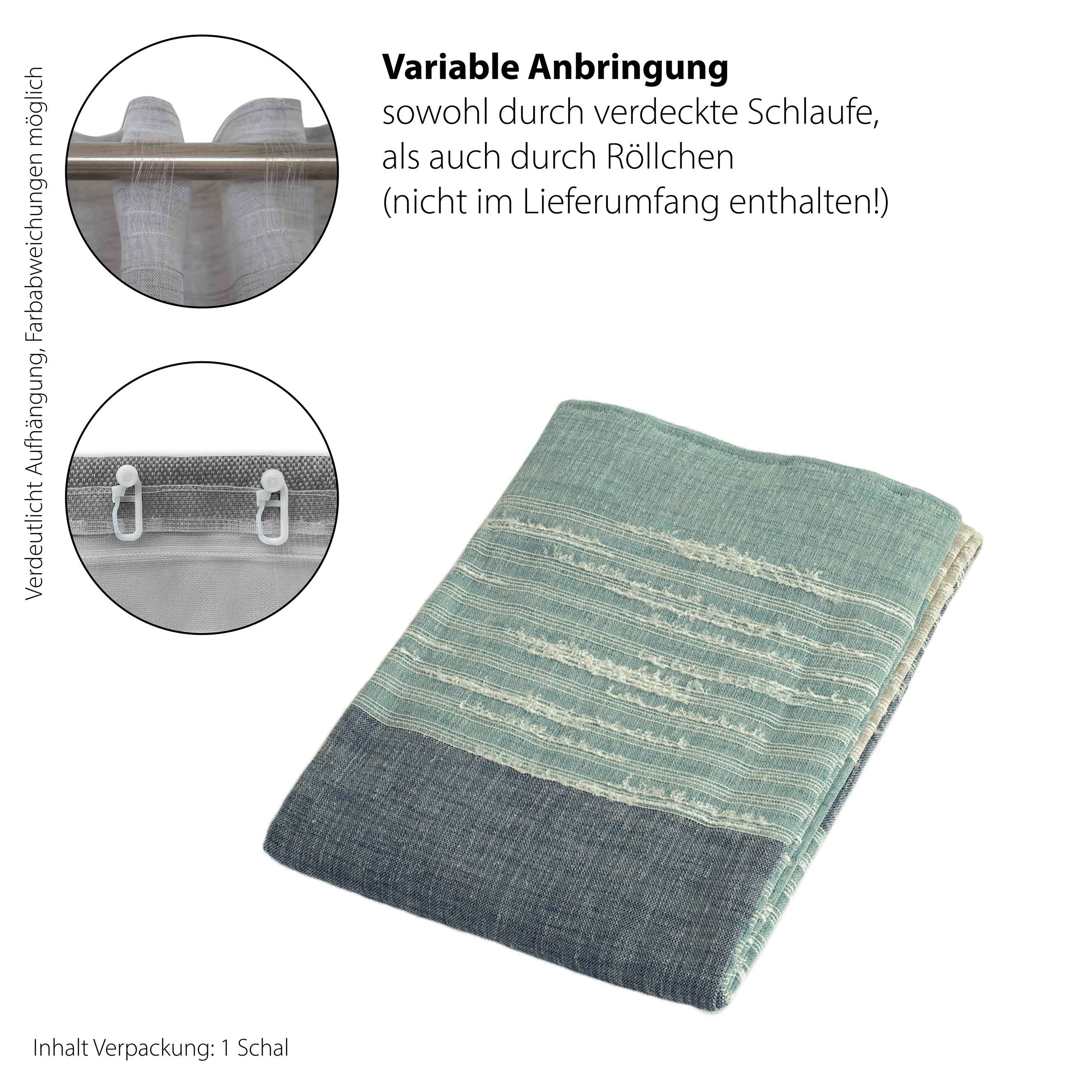 Der halbtransparente, verdeckte Schalufenschal Marina besticht mit schlichter Eleganz. Die Querstreifen enthalten feine Sherli-Elemente und verliehen Marina einen trendigen Used-Look. Der Schal kommt in drei Farbvarianten daher und lässt sich mit den stabilen verdeckten Schlaufen aus Nylon, welche von hinten fast unsichtbar sind, einfach auf einer Gardinenstange aufhängen.