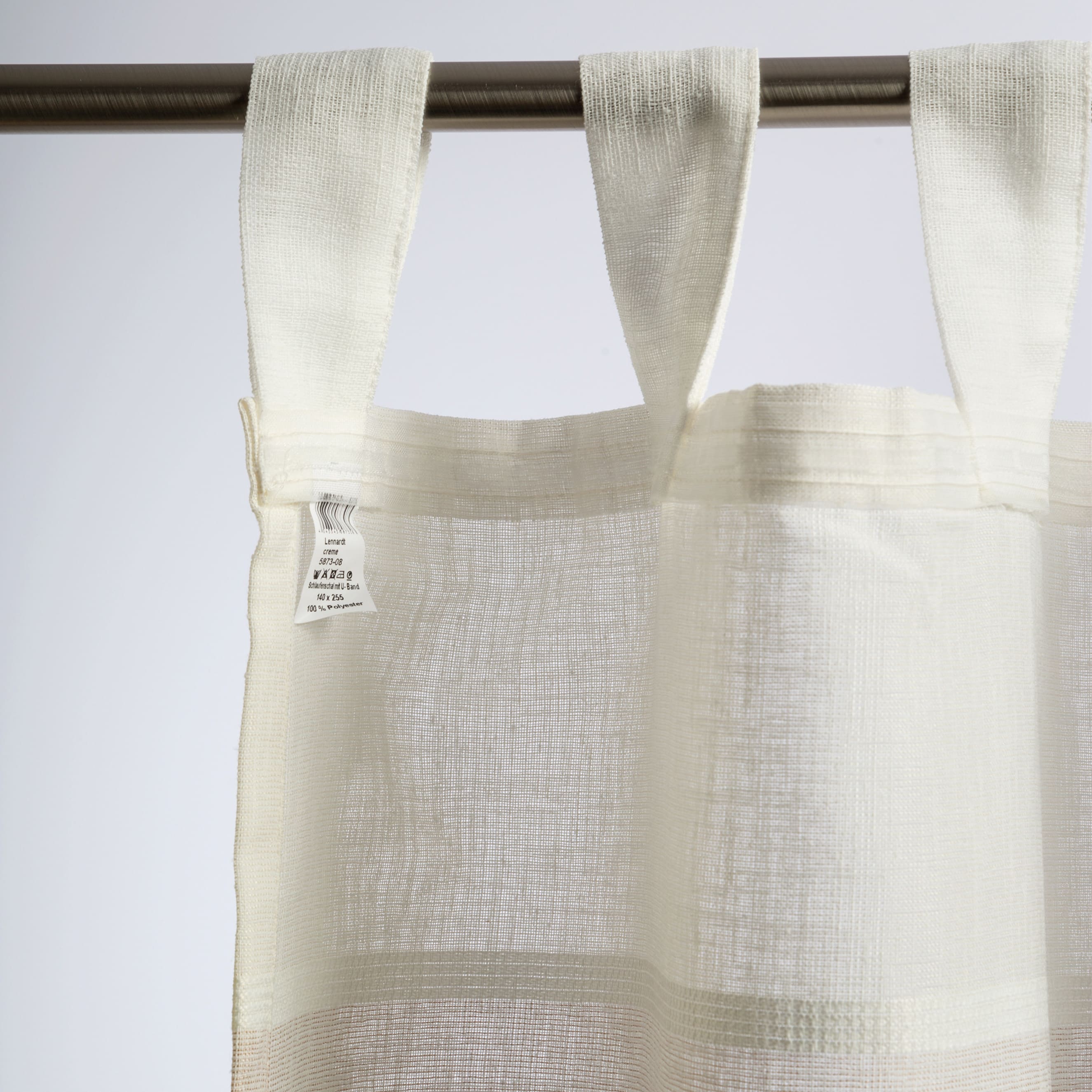 Der Vorhang mit halbtransparenter Oberfläche ist aus 100% Polyester gefertigt. Damit ist die Gardine sowohl formbeständig sowie strapazierfähig und hat zudem eine hohe Lichtbeständigkeit.