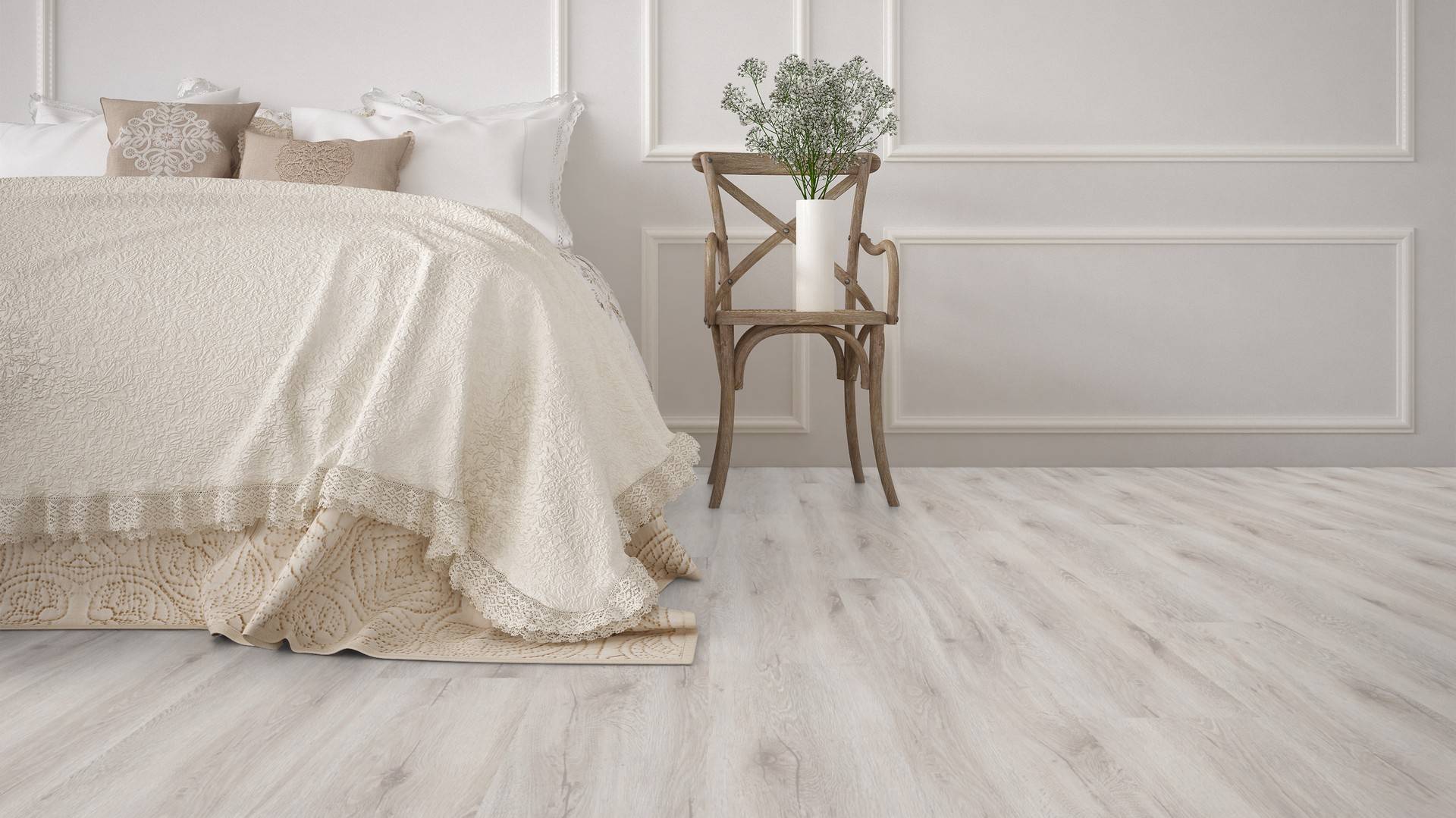Der Bodenbelag in White Washed Wood überzeugt durch seine perfekte Imitation natürlicher Holzböden. Die feine Maserung verleiht dem Boden eine authentische und hochwertige Ausstrahlung die an Böden aus Eicheerinnert. Dank der vielseitigen Farbgebung passt er zu jedem Einrichtungsstil und schafft eine harmonische Atmosphäre in deinem Zuhause.