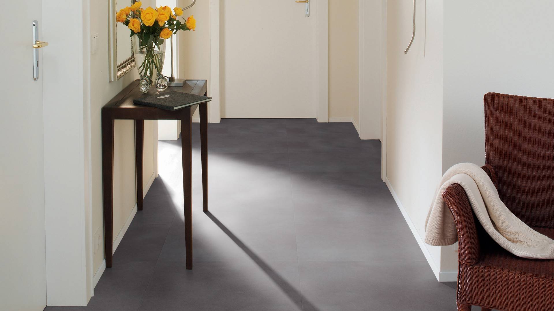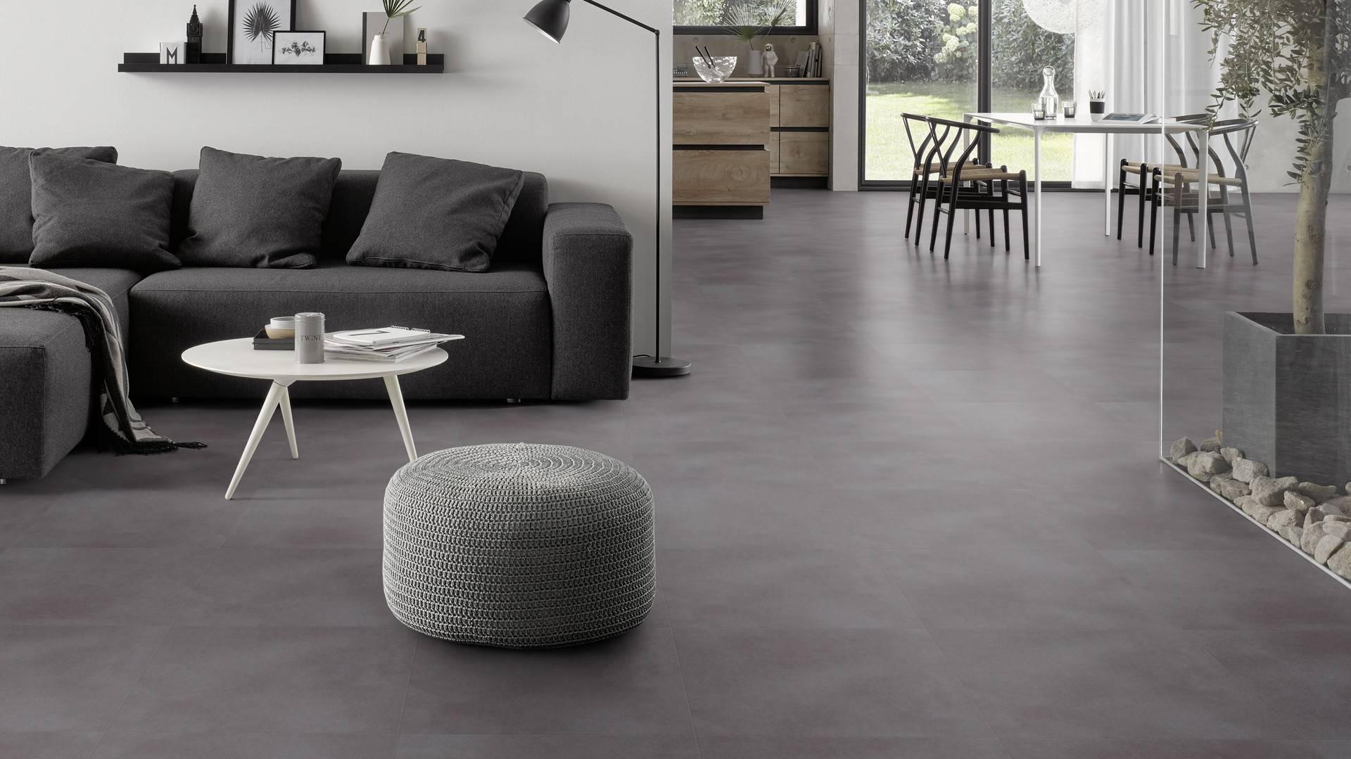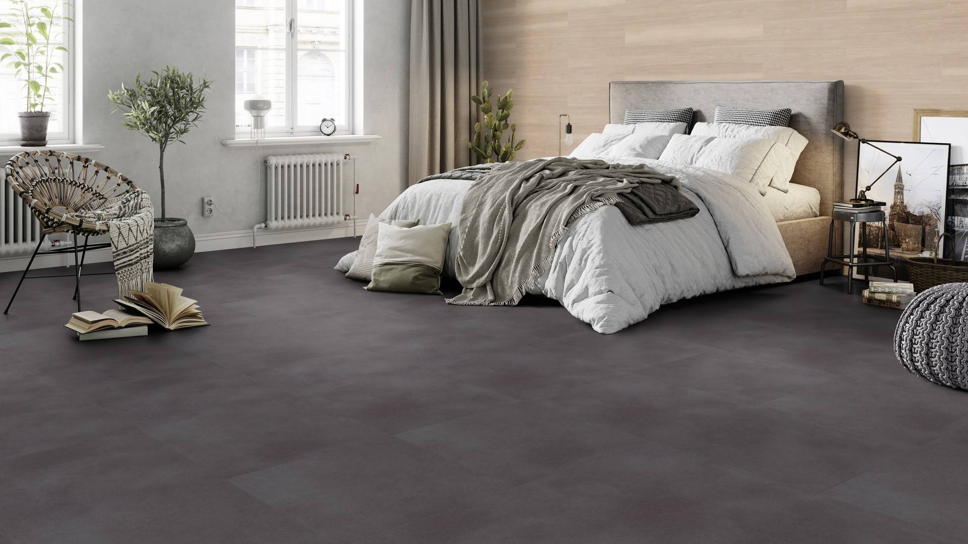 Der Bodenbelag inDark Grey Concrete überzeugt durch seine perfekte Imitation natürlicher Holzböden. Die feine Maserung verleiht dem Boden eine authentische und hochwertige Ausstrahlung die an Böden aus Betonbödenerinnert. Dank der vielseitigen Farbgebung passt er zu jedem Einrichtungsstil und schafft eine harmonische Atmosphäre in deinem Zuhause.