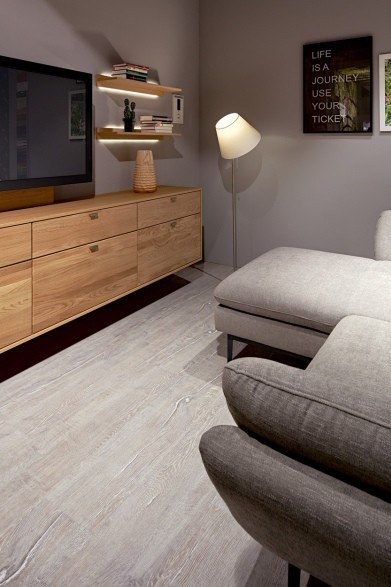 Jeder Designboden der floors@home Kollektion basiert auf einer Kunststoffrückenschicht, gefolgt von einer stabilisierenden Trägerschicht, auf der das beeindruckende Dekor ruht. An der Spitze des Designbodenbelags befindet sich die transparente Nutzschicht, bestehend aus PVC und zusätzlich mit einer Oberflächenvergütung aus Polyurethan (PU) versehen.